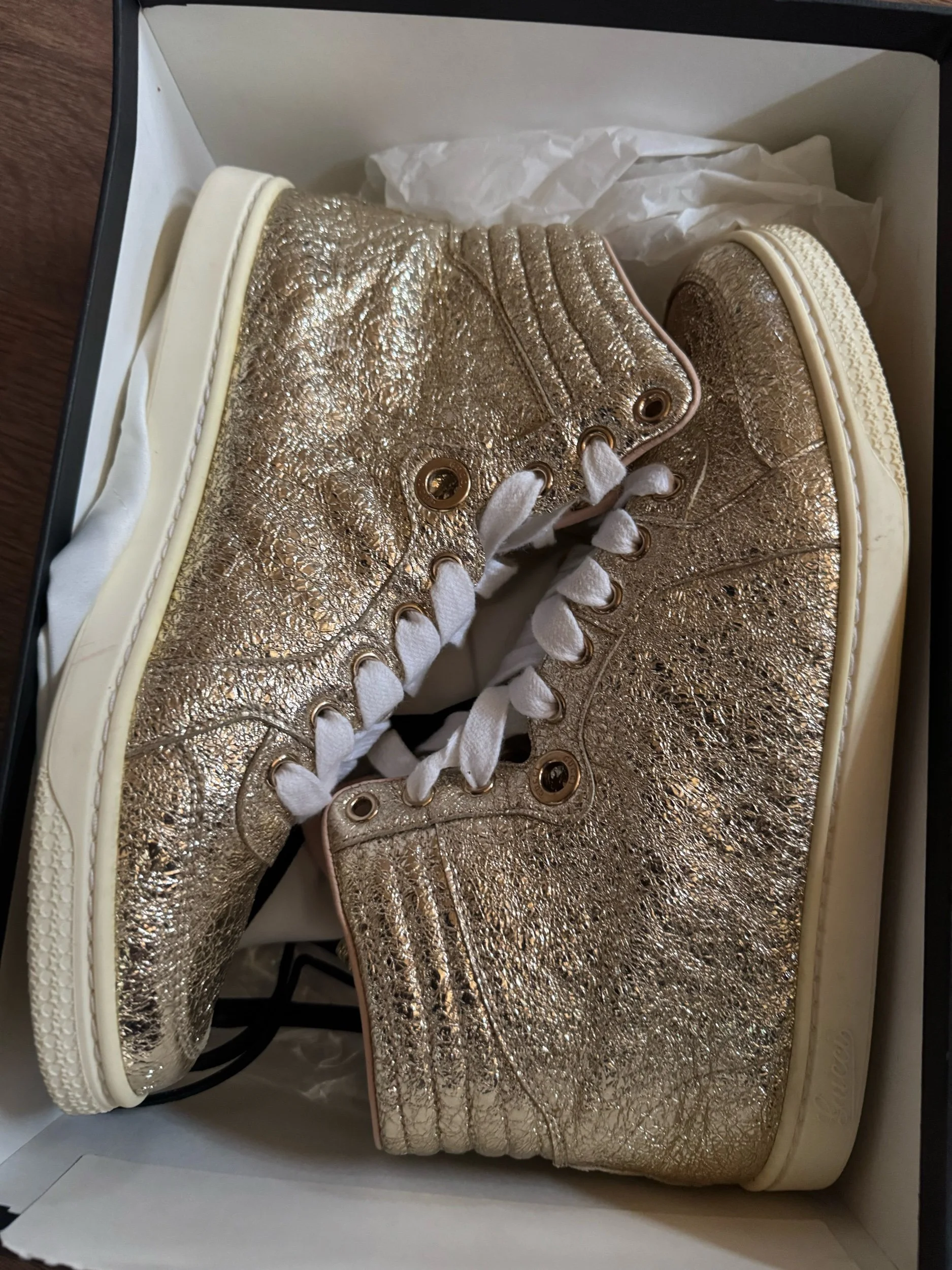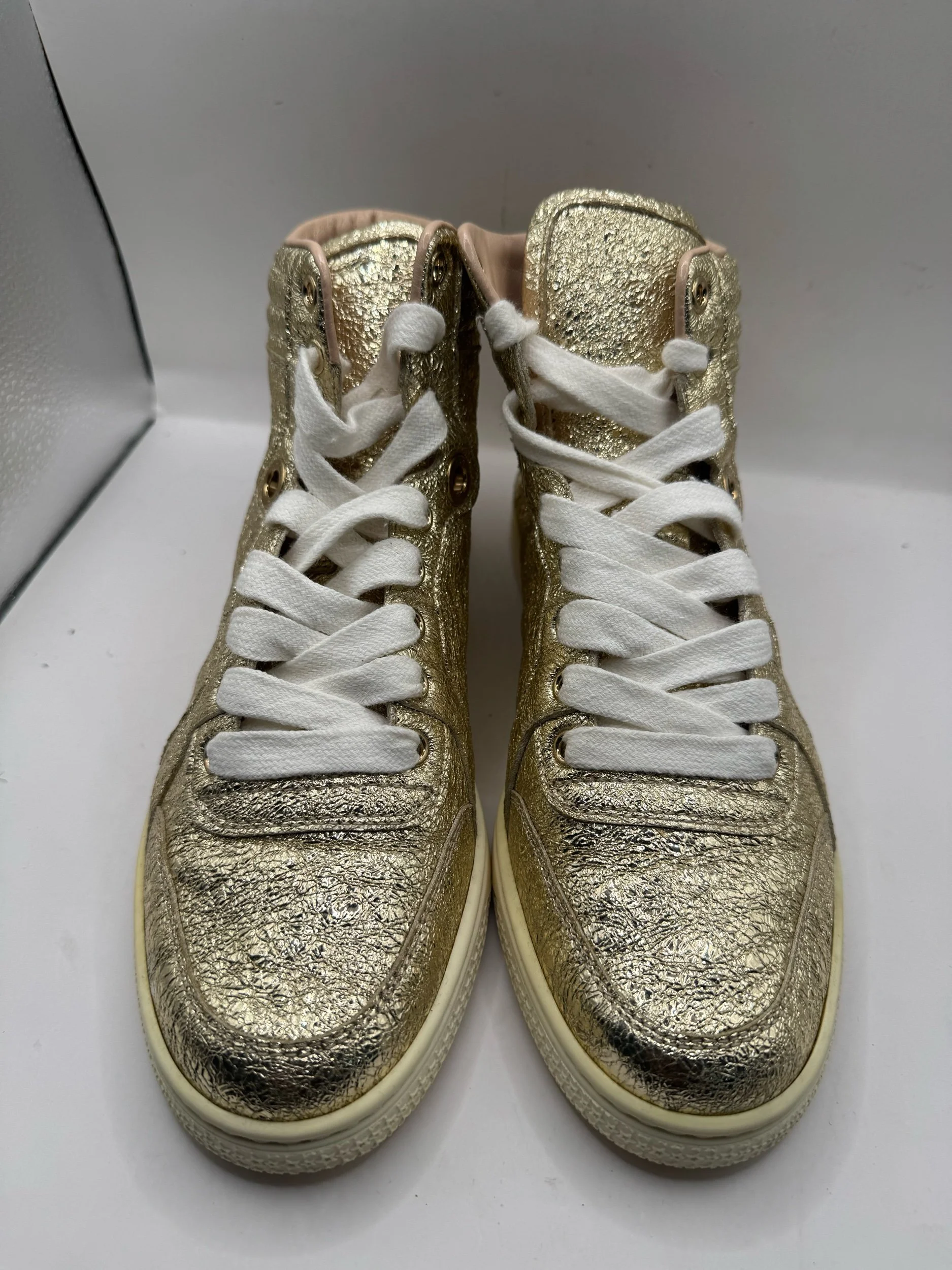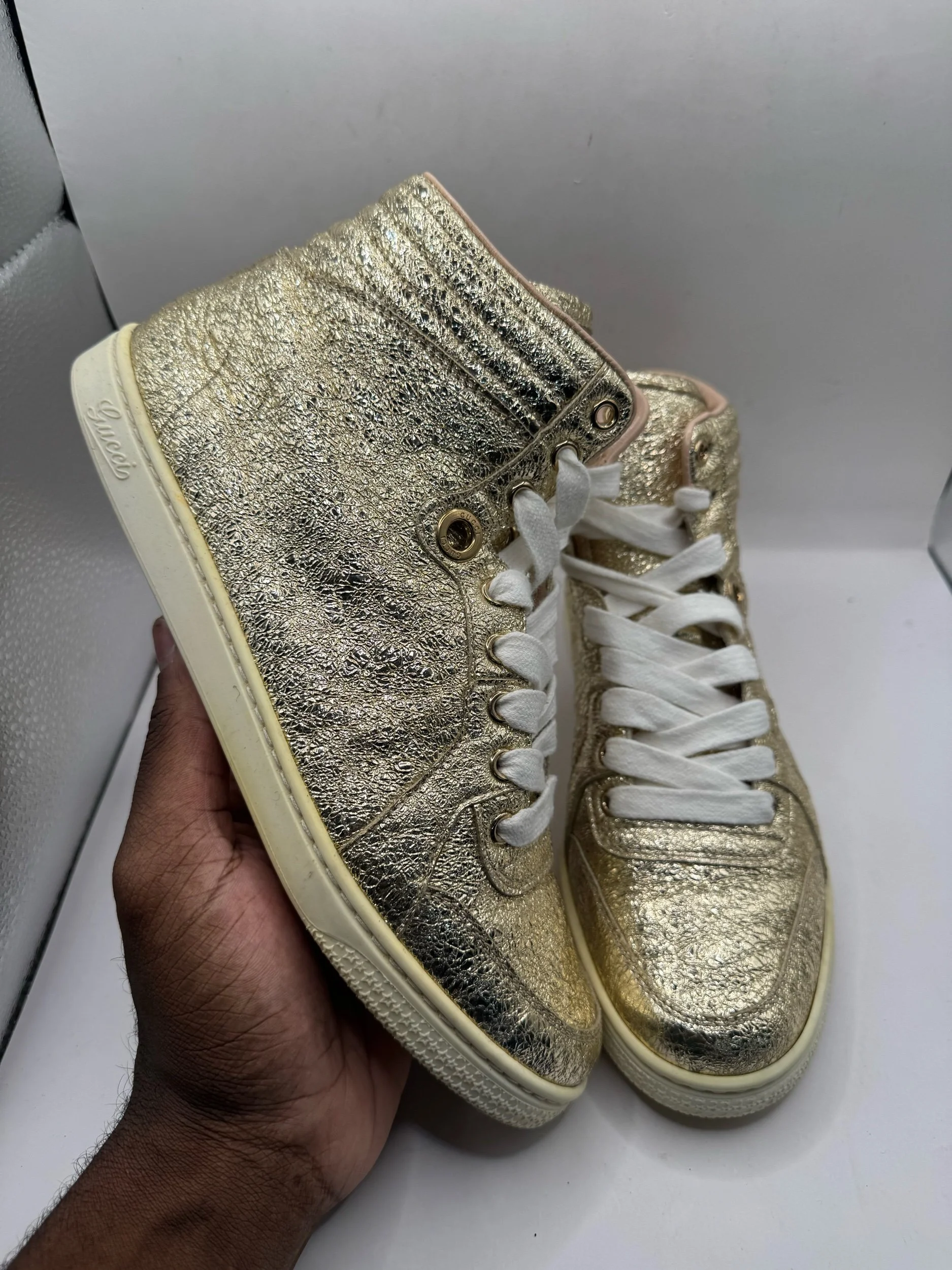 Men Shoes › Gucci Monogram Hightop Sneakers Gucci Guccissim Gold GG high tops 38 Image 1 of 12 Image 2 of 12 Image 3 of 12 Image 4 of 12 Image 5 of 12 Image 6 of 12 Image 7 of 12 Image 8 of 12 Image 9 of 12 Image 10 of 12 Image 11 of 12 Image 12 of 12 Gucci Monogram Hightop Sneakers Gucci Guccissim Gold GG high tops 38 $60.00 Add To Cart Added!
